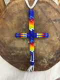 This cross measures 6"h x 2.50"w and features royal blue, red, orange, yellow, green and white beads accented with white leather tassels. The white leather tie measures 11"l.
