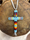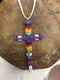 This cross measures 5"h x 2.25"w and features iridescent pink, black, red, orange, yellow and white beads accented with an intricate feather design and white leather tassels. The white leather tie measures 9"l.