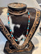 This gorgeous 18" silver pearl necklace features turquoise stones with beautiful brown marbling and is accented by intricate etching on the larger pearls.