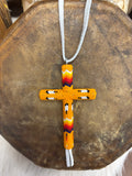 This cross measures 4"h x 2"w and features orange, yellow, red, black and white beads accented with an intricate feather design and white leather tassels. The white leather tie measures 9"l.