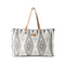 This beautiful tribal-inspired weekender is crafted from woven upcycled rug and canvas. Its fringe detail, front stitching, and zippered pocket complete this must-have bag.