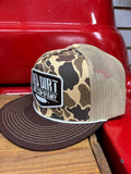 Classic camo, 5-panel, flat bill, snapback featuring the "Old Skool" patch, tan mesh, dark brown bill, and white rope.